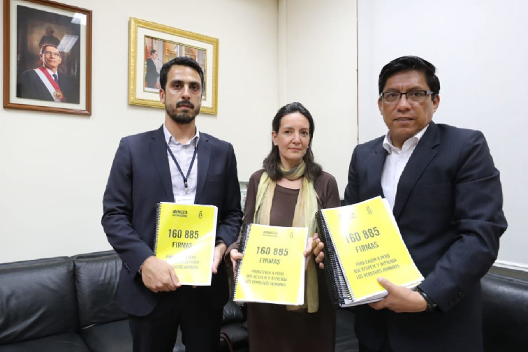 (Lima, 3 de diciembre de 2019). En una reunión que se llevó a cabo el día de ayer en la Presidencia del Consejo de Ministros (PCM), Marina Navarro, directora de Amnistía Internacional en Perú, entregó al titular de la PCM, Vicente Zeballos, 163.435 firmas recogidas durante 2019, exigiendo al Estado Peruano medidas a favor de los derechos humanos en cinco temas prioritarios.