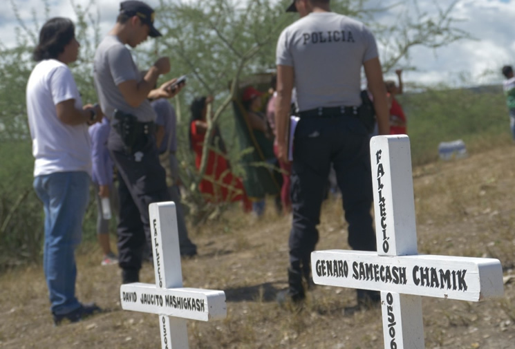 “Lo hemos enterrado en la comunidad, hemos hecho una ceremonia para él”, cuenta el tío. En la casa de Orfidia está colgada una gigantografía con las fotos de todos los awajún caídos: su hijo Davis Jaucito Mashingtash (19), Romel Tenazoa Sanchez (27), Felipe Savio Cesar, Genaro Chijiap Chamic (31), Jesus Carlos Timias Juwan (19).