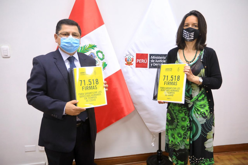 (Lima, 10 de diciembre de 2020). En el marco del Día Internacional de los Derechos Humanos, que se conmemora hoy, Amnistía Internacional Perú se reunió con representantes del Ministerio de Justicia y Derechos Humanos (MINJUSDH), y entregó al titular de esta cartera, Eduardo Vega, 77 106 firmas de ciudadanos y ciudadanas a favor de los derechos humanos.