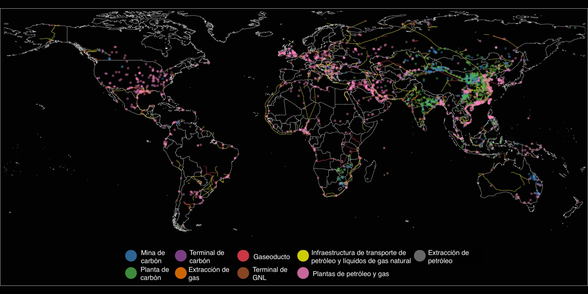 Mapa que muestra la ubicación de más de 18.000 instalaciones de combustibles fósiles en funcionamiento de las que se conoce la existencia, codificadas por colores según el tipo de infraestructura.